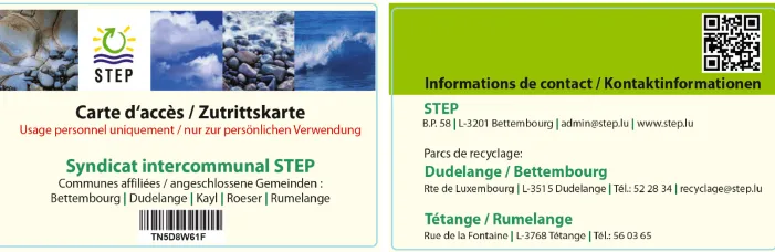 Cette carte d’accès vous donne accès aux deux centres de recyclage pendant les heures d’ouverture.